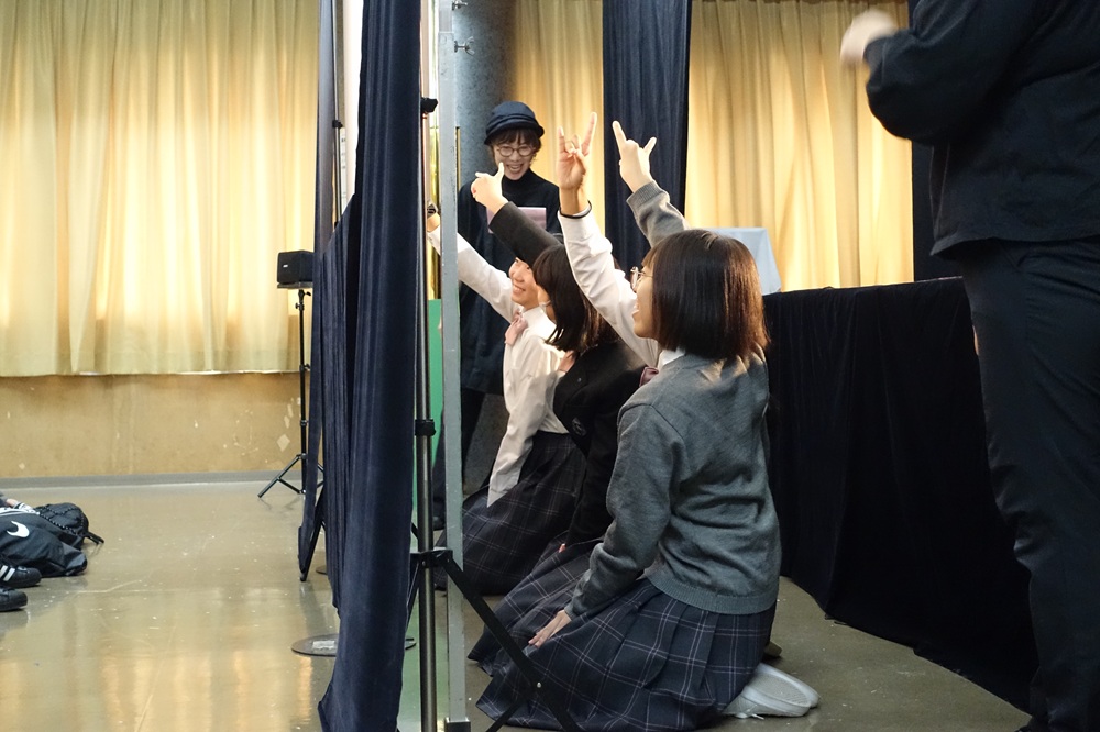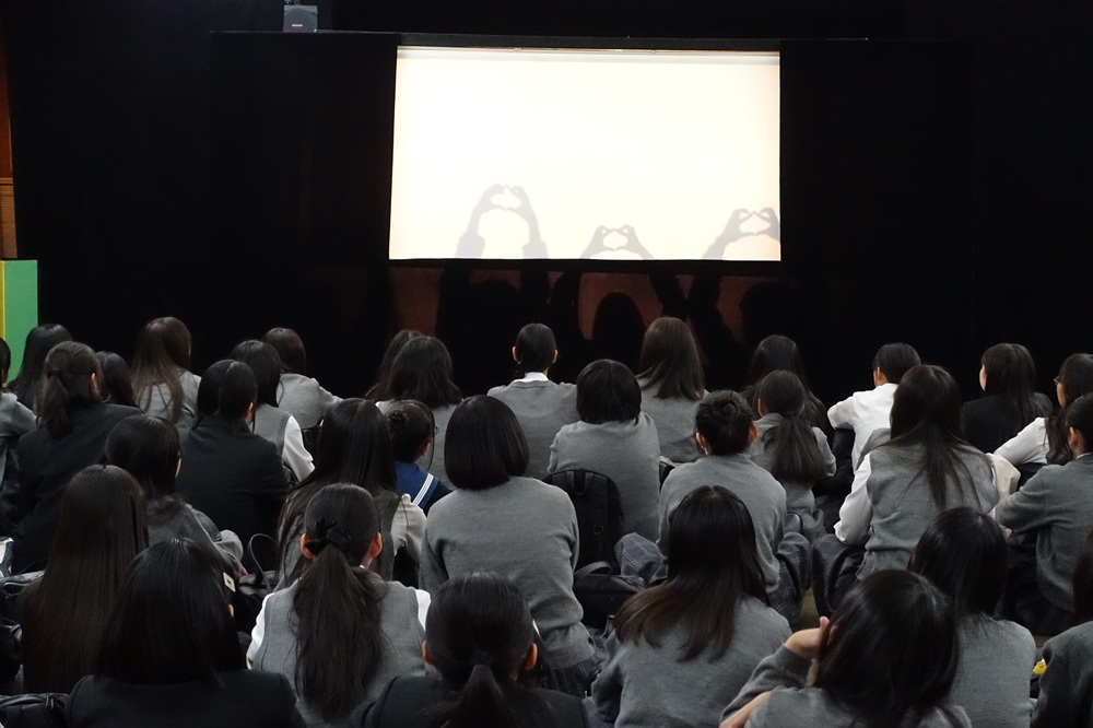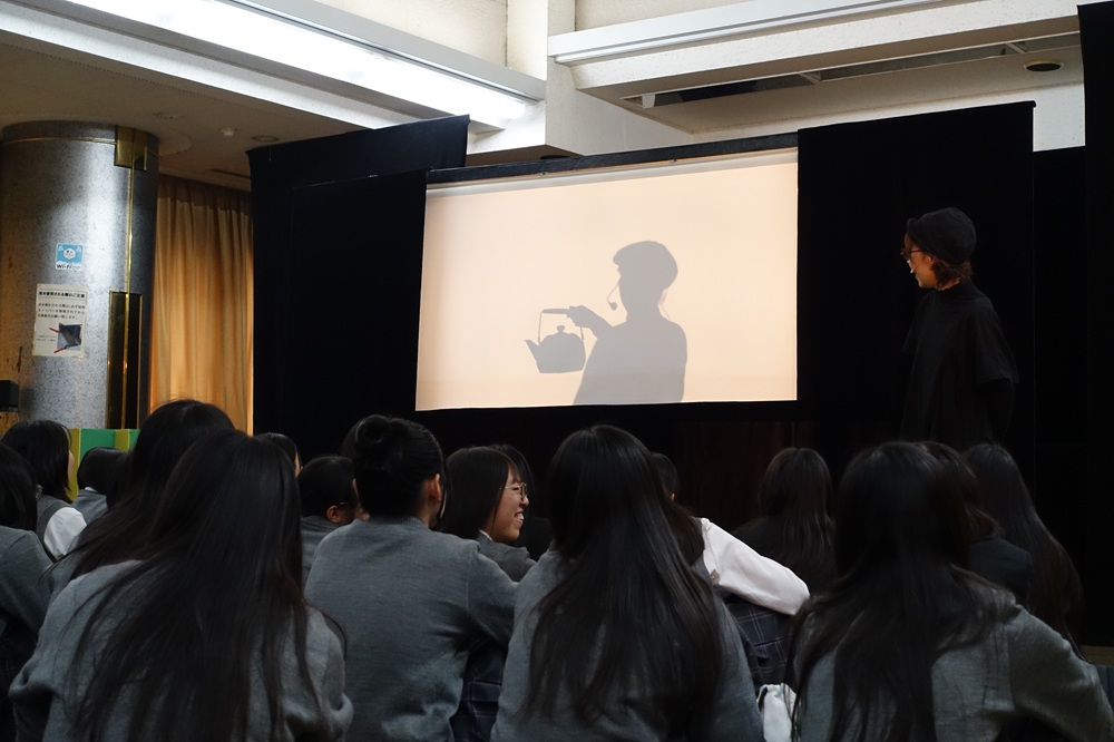 影絵の体験では、実際に生徒たちが舞台に立ち、手や指の動かし方を工夫しながら演じる貴重な機会をいただきました。