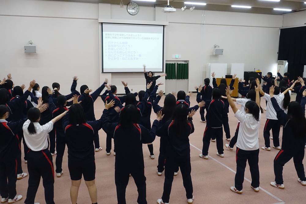「バナナ体操」「猛獣狩り」「やどかりと屋根」などの遊びを通して、実際に体を動かし実践しながら幼児期の運動遊びの重要性について学びました。