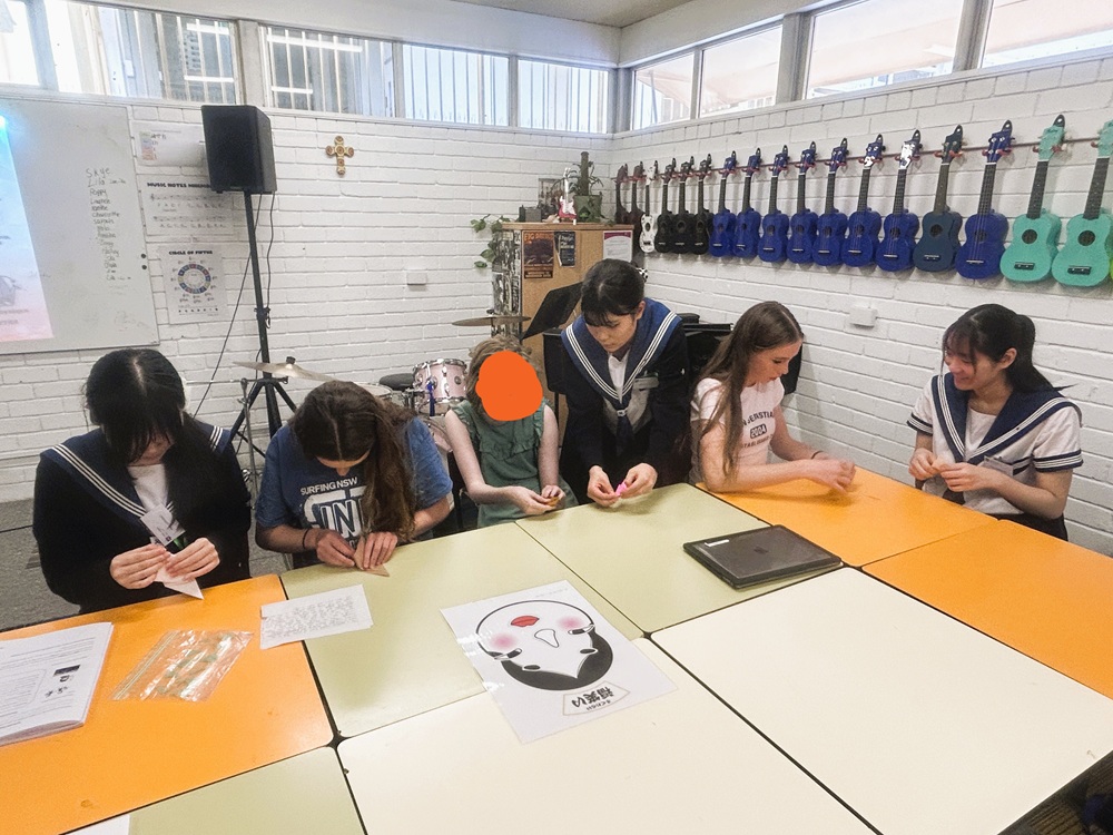 文化やお菓子に関するクイズ、福笑いを楽しんだあと、最後に折り紙でツルを一緒に折りました。
