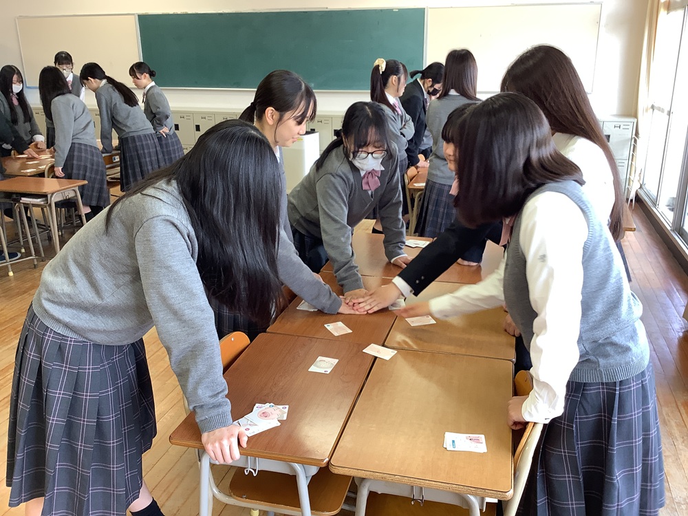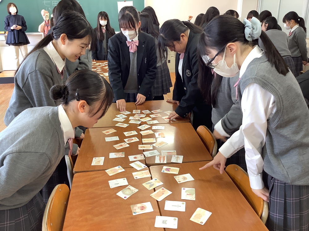 看護医療進学コース「ひとのからだカルタ」「ケリーパード作り」の様子